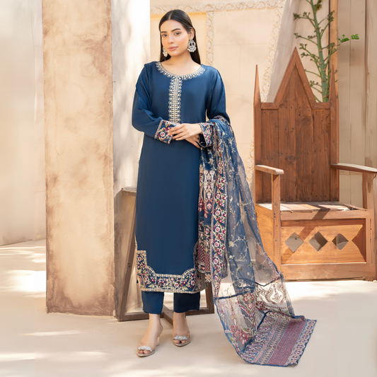 Regular price £29.99 GBPRegular priceUnit price perSale price £29.99 GBP(Navy Blue) 3 Pc Dhanak Dress with Embroidered Wool Shawl Dupatta | Winter Wear | RANIYA.H