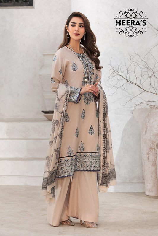 (BEIGE K.H) 3 Pc Embroidered Cambric Cotton Suit-Heera's