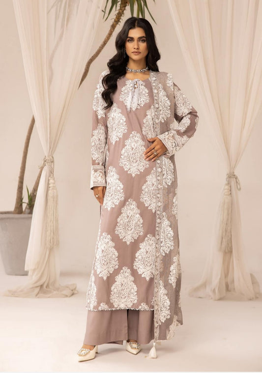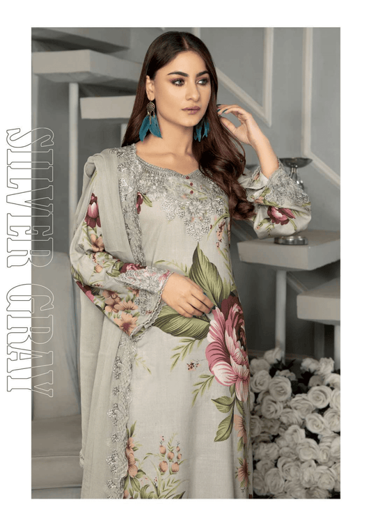 Silver Grey 3 Piece Linen Suit-Embroidered (Simrans)