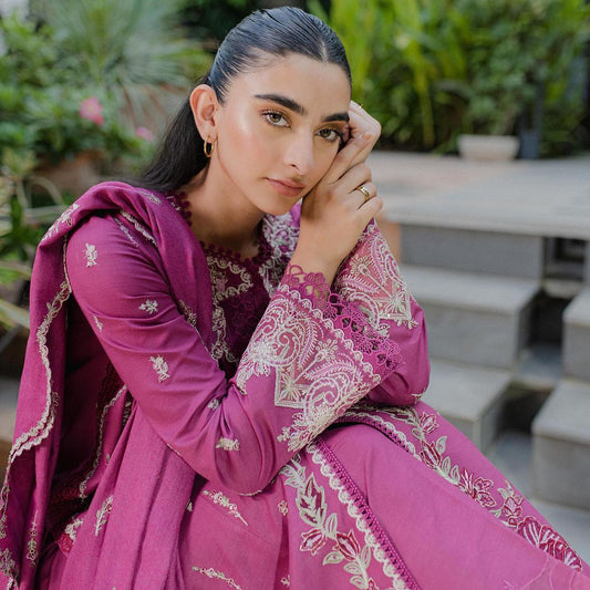 3 PC EMBROIDERED SCHIFFLI DHANAK DRESS WITH WOOL SHAWL-MUNIRA