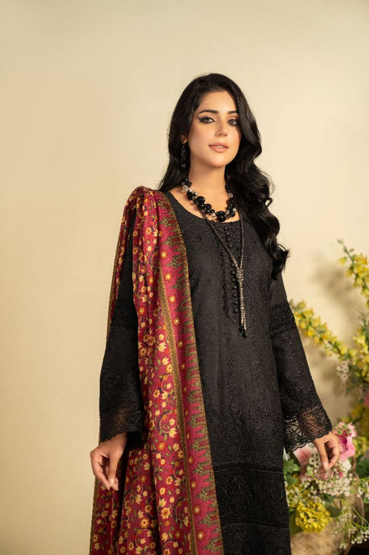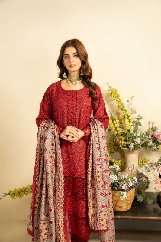 3 PC EMBROIDERED SCHIFFLI DHANAK DRESS WITH WOOL SHAWL-MUNIRA