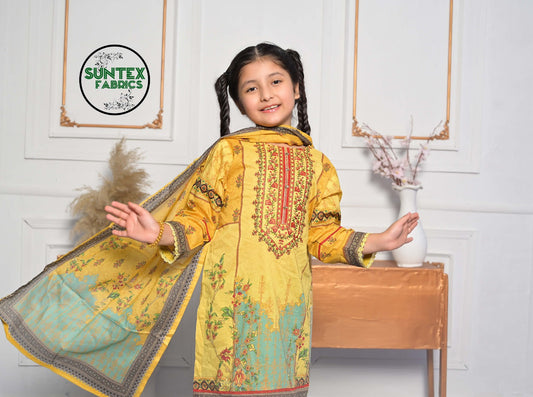 YELLOW 3 PIECE PRINTED KAMEEZ WITH EMBROIDERED CHIFFON DUPPATA