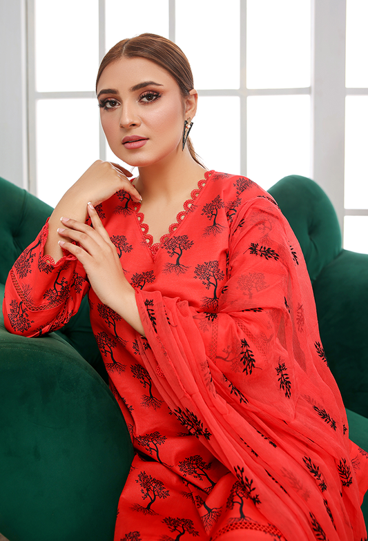 RED 3 PIECE PRINTED KAMEEZ WITH EMBROIDERED CHIFFON DUPPATA