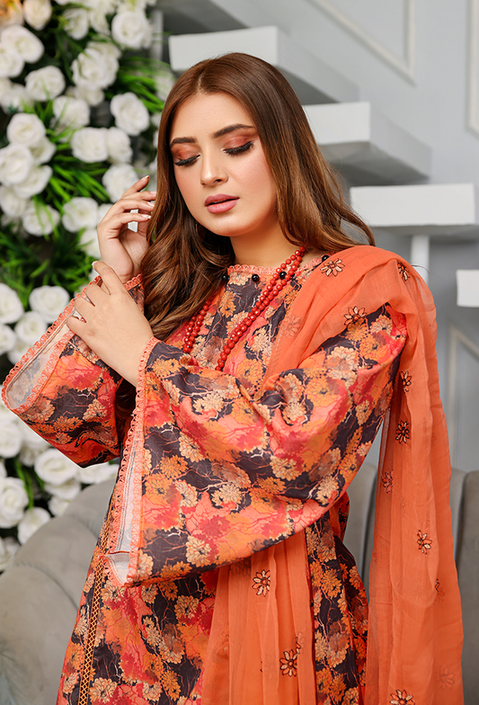 ORANGE 3 PIECE PRINTED KAMEEZ WITH EMBROIDERED CHIFFON DUPPATA
