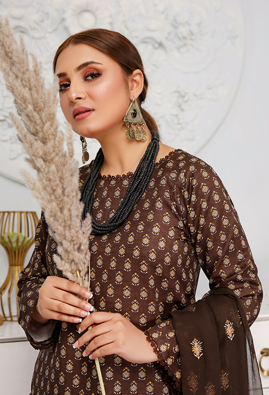 Brown printed +embroidered lawn dress