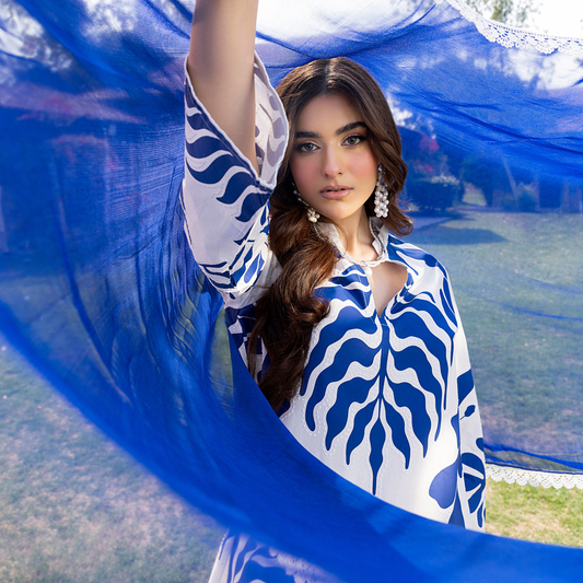 Regular price £34.99 GBPRegular priceUnit price perSale price £34.99 GBPUHE-56 (Blue& White) trendy Farshi Shalwar Printed Cambric Cotton Embroidered Dress | Ready to Wear | Heera's