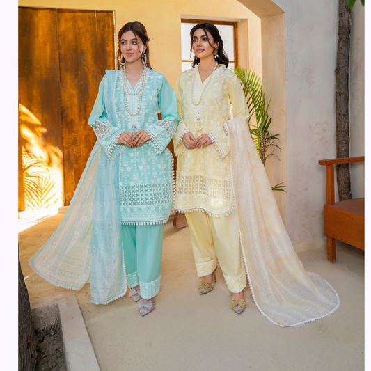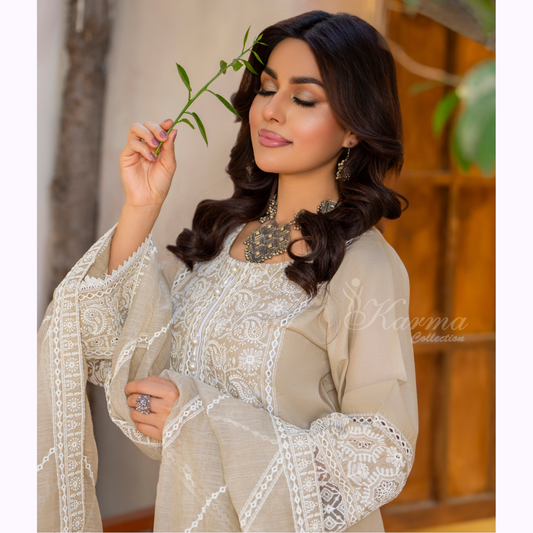 Regular price £44.99 GBPRegular priceUnit price perSale price £44.99 GBPKC-1441 Embroidered Chikenkari Cambric Cotton Farshi Shalwar Ready to Wear 3 Pc - Karma Collection