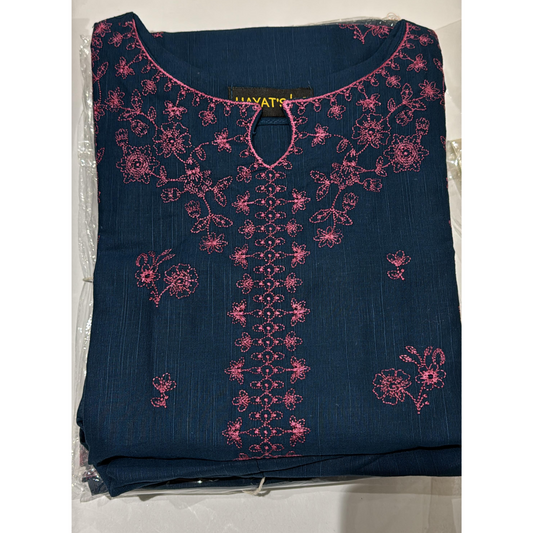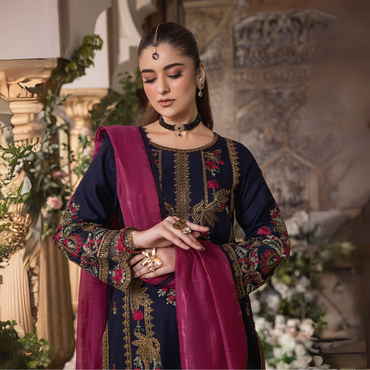 (Navy) 3 Pc Embroidered Cambric Cotton Ready to Wear Dress | Eid Wear | Heera's