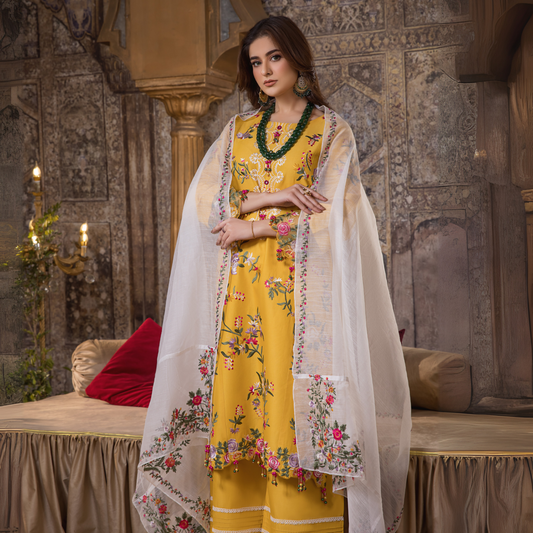(Yellow) 3 Pc Embroidered Cambric Cotton Ready to Wear Dress | Eid Wear | Heera's