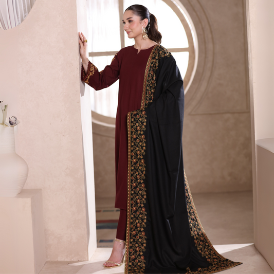UA-29 3 Pc Embroidered Dhanak Dress with Embroidered Dhanak Shawl Pakistani Dress | UMNAA
