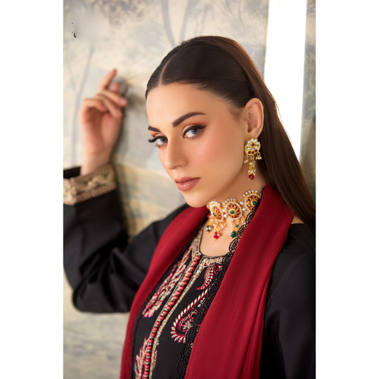 (Black) 3 Pc Embroidered Viscose Linen Pakistani Dress With Chiffon Dupatta | Winter Wear | Heera's