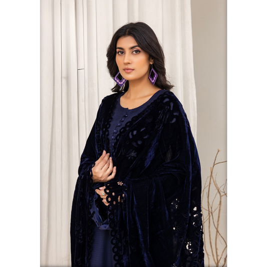 Regular price £31.99 GBPRegular priceUnit price perSale price £31.99 GBP(Navy Blue) 3 Pc Dhanak Dress with Laser Velvet Shawl | Winter Collection | Rangz | UMRGZ3506