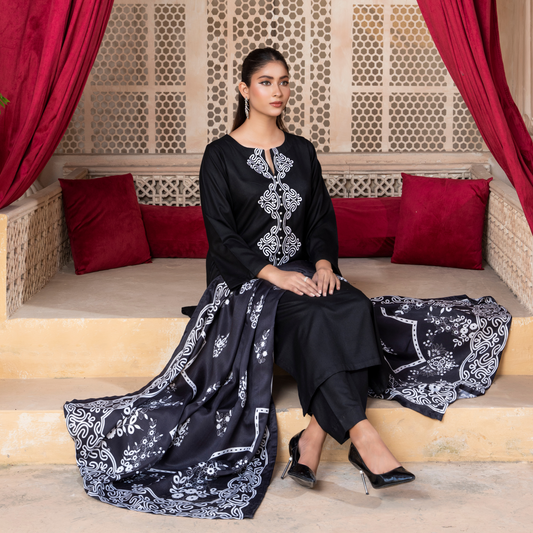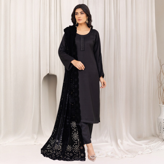 (Black) 3 Pc Dhanak Dress with Laser Velvet Shawl | Winter Collection | Rangz | UMRGZ3503