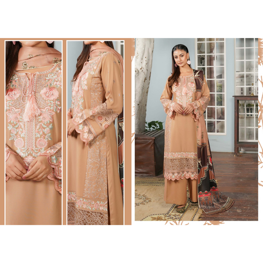 (Tan Peach) Heavy Embroidered Dhanak Ready to Wear Dress - MUNIRA
