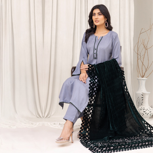 (Grey) 3 Pc Dhanak Dress with Laser Velvet Shawl | Winter Collection | Rangz | UMRGZ3505