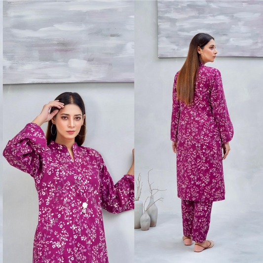 (Purple) 2 Pc floral Printed Khaddar Pakistani Co-Ords Set | Ready to wear| Naubahar