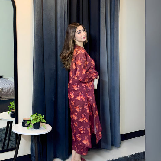 (Maroon) 2 Pc floral Printed Khaddar Pakistani Co-Ords Set | Ready to wear| Naubahar