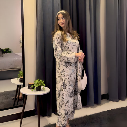 Regular price £20.00 GBPRegular priceUnit price perSale price £20.00 GBPCream 2 Pc floral Printed Khaddar Pakistani Co-Ords Set | Ready to wear| Hayats