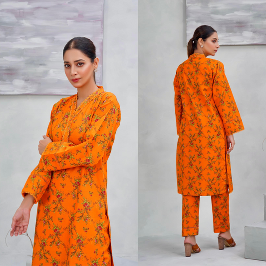 Orange 2 Pc floral Printed Khaddar Pakistani Co-Ords Set | Ready to wear| Hayats