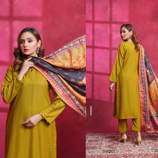 (Yellowy Brown) Dhanak Dress with Wool Shawl |3 Pc| Winter Collection | Hayats