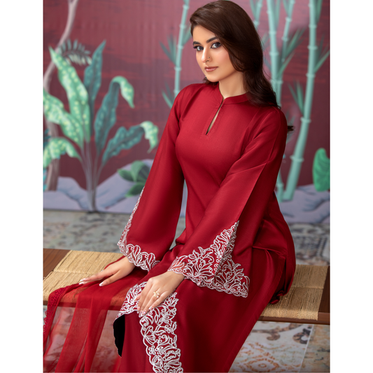 (Red) 3 Pc Embroidered Dhanak Pakistani Dress With Chiffon Dupatta | Winter Wear | Heera's