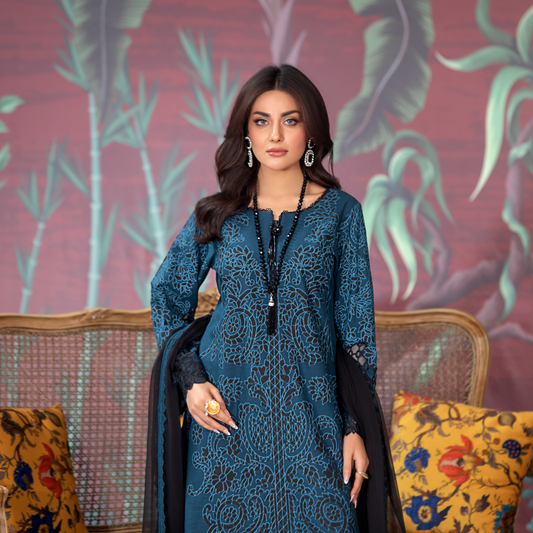 (Blue) 3 Pc Embroidered Dhanak Pakistani Dress With Chiffon Dupatta | Winter Wear | Heera's