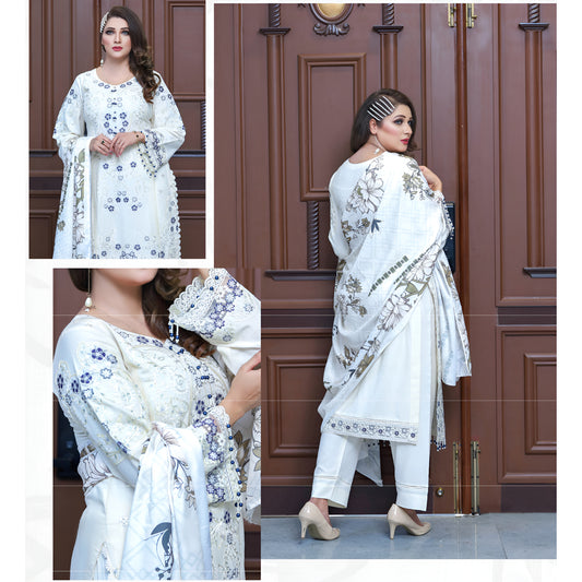 (White) 3 Pc Embroidered Dhanak Dress with wool Shawl | Winter Collection | UB