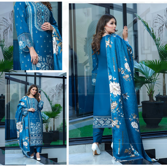(Blue) 3 Pc Embroidered Dhanak Dress with wool Shawl | Winter Collection | UB