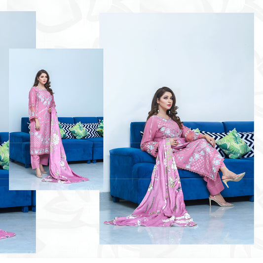 (Light Orchid) 3 Pc Embroidered Dhanak Dress with wool Shawl | Winter Collection | UB