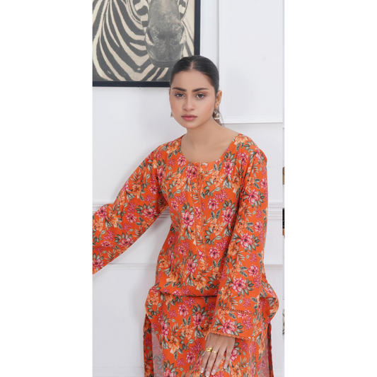 orange 2 Pc floral Printed Khaddar Pakistani Co-Ords Set | Ready to wear| Hayats