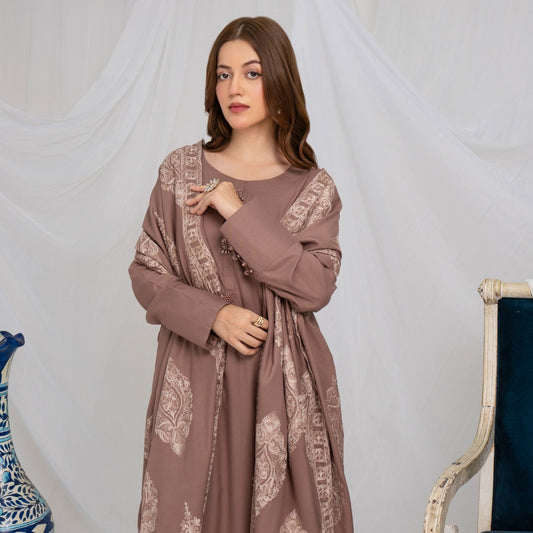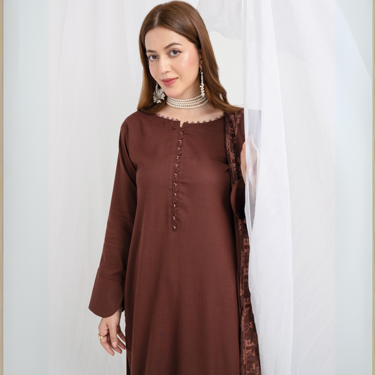 (dark chestnut ) 3 Pc Dhanak Shirt & trouser with Dhanak Shawl | Winter Collection | SIMRANS