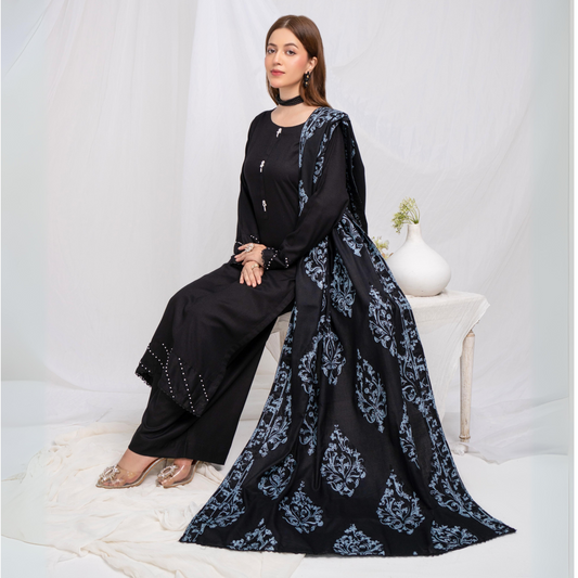 (black) 3 Pc Dhanak Shirt & trouser with Dhanak Shawl | Winter Collection | SIMRANS
