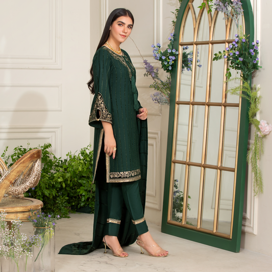 (Green) 3 Pc Embroidered Dhanak Velvet Ready to Wear Dress | Winter Wear | Heera's