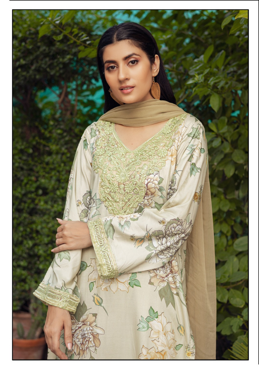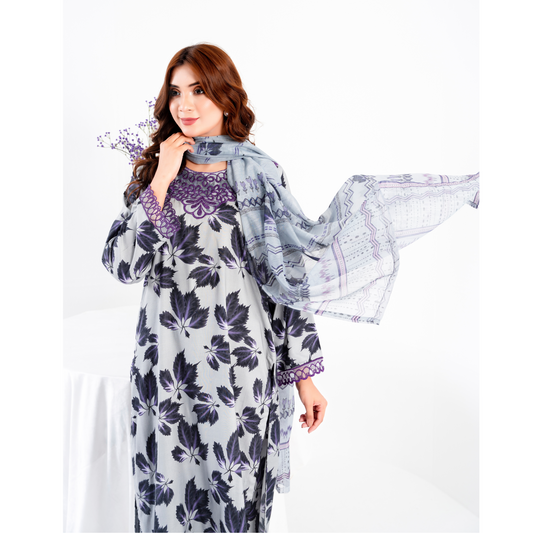 (Pale Grey) 3 Pc Printed Floral Embroidered Linen Dress Winter Wear | Raniya.h