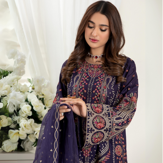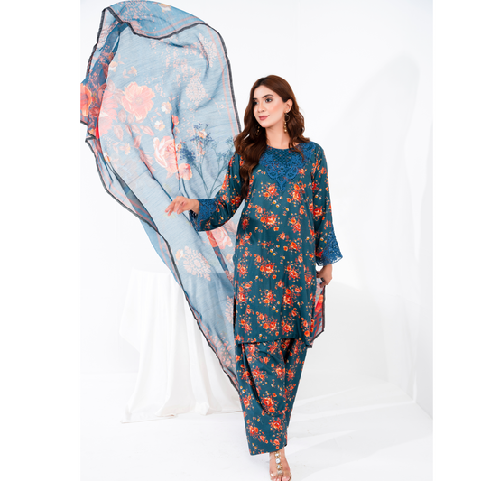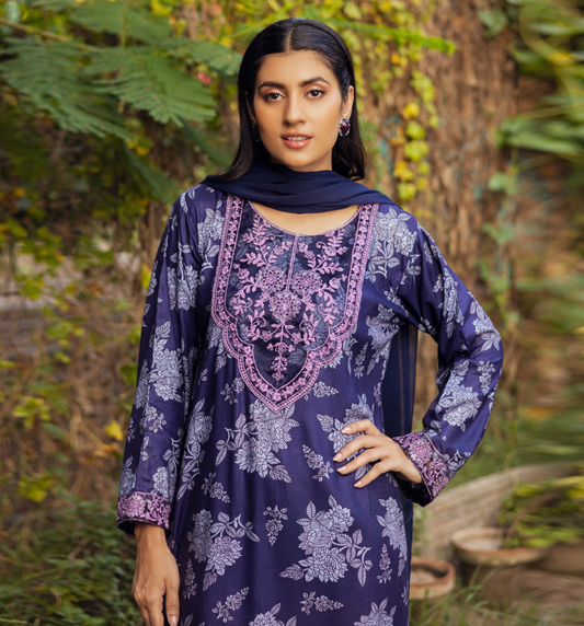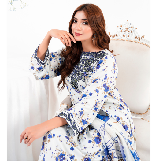 (Regal blue) 3 Pc Printed Floral Embroidered Linen Dress Winter Wear | Raniya.h