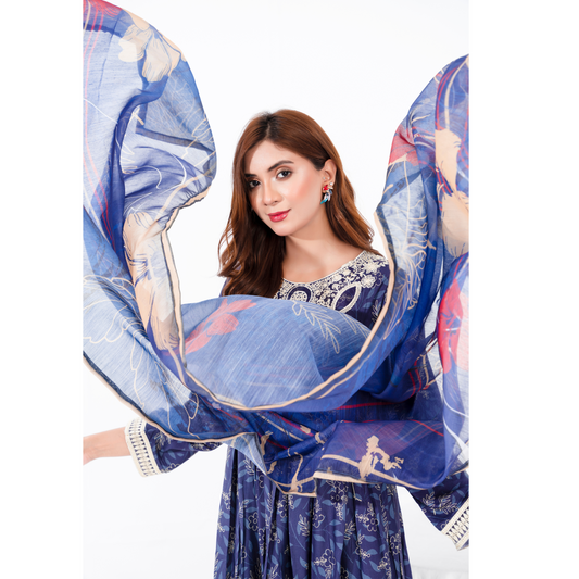 Blue & White | Printed Linen Shirt & Trouser With Chiffon Dupatta| Ready to Wear 3 Pc dress - Rangz