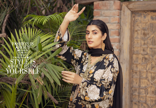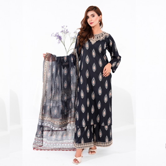 (Black) 3 Pc Printed Floral Embroidered Linen Dress Winter Wear | Raniya.h
