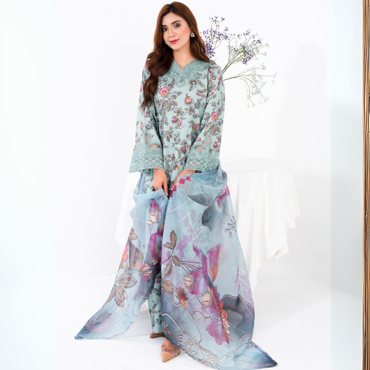 (Pale Aqua) 3 Pc Printed Floral Embroidered Linen Dress Winter Wear | Raniya.h