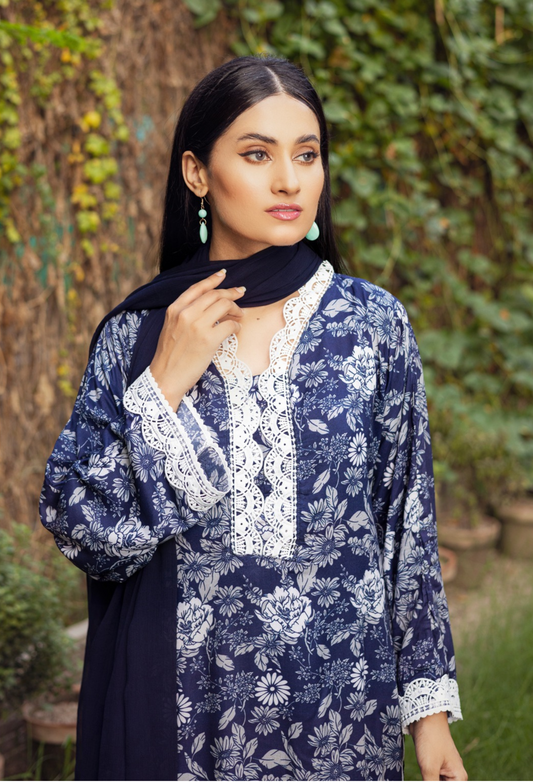 (Navy blue) 3 Pc Printed Floral Embroidered Linen Dress Winter Wear | Raniya.h