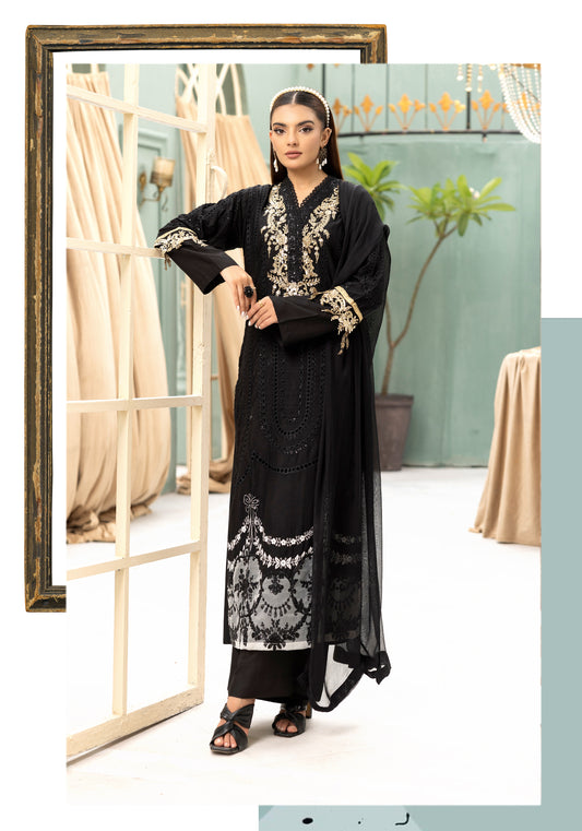 (Black) Embroidered Linen with Chiffon Duppatta - Simrans