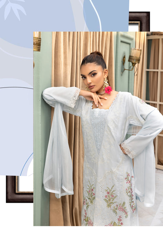 (Light Grey ) Embroidered Linen with Chiffon Duppatta - Simrans