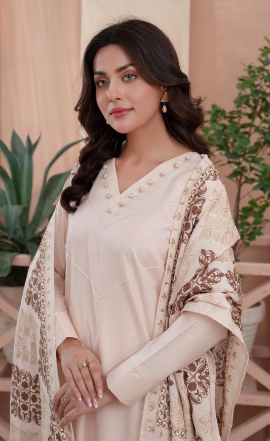(Cream) 3 Pc Dhanak Dress with Embroidered Wool Shawl Dupatta | Winter Wear | RANIYA.H