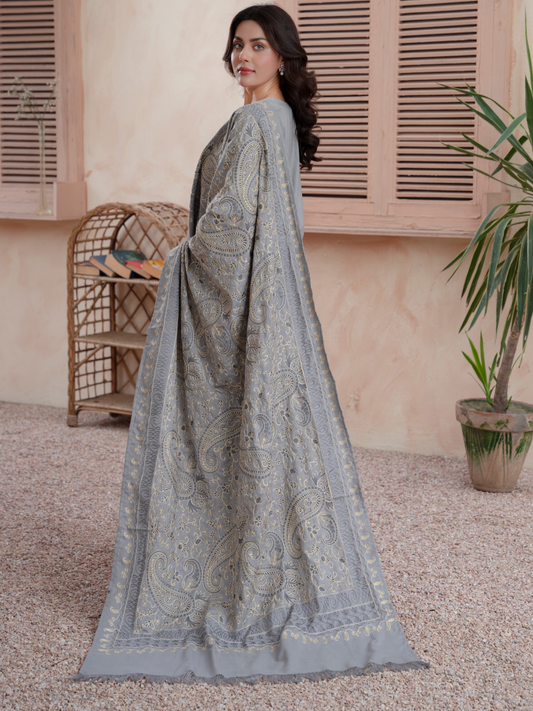 (Grey) 3 Pc Dhanak Dress with Embroidered Wool Shawl Dupatta | Winter Wear | RANIYA.H