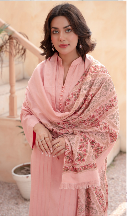 (Pink) 3 Pc Dhanak Dress with Embroidered Wool Shawl Dupatta | Winter Wear | RANIYA.H