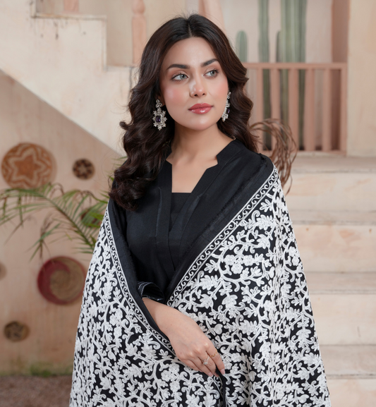 (Black) 3 Pc Dhanak Dress with Embroidered Wool Shawl Dupatta | Winter Wear | RANIYA.H