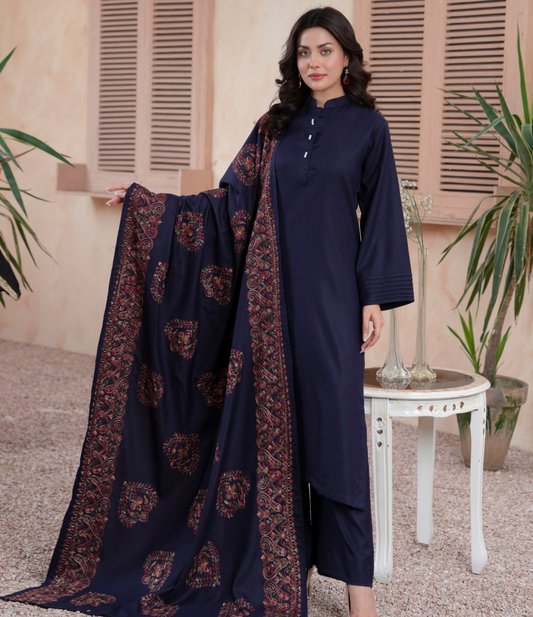 (Navy Blue) 3 Pc Dhanak Dress with Embroidered Wool Shawl Dupatta | Winter Wear | RANIYA.H