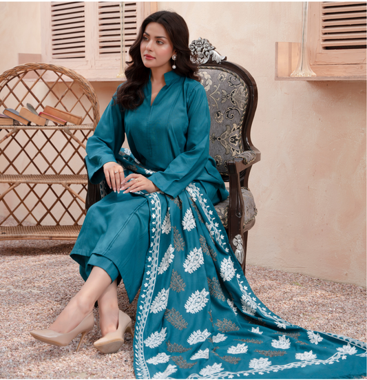 (Deep Aqua Blue) 3 Pc Dhanak Dress with Embroidered Wool Shawl Dupatta | Winter Wear | RANIYA.H