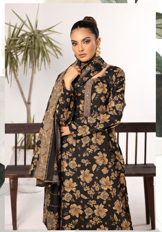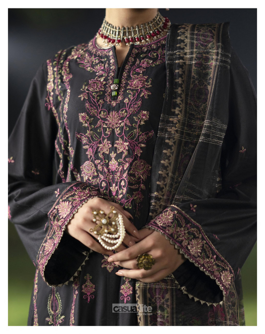 (Black) Embroidered Linen 3 Pc Ready to Wear by Casuallite