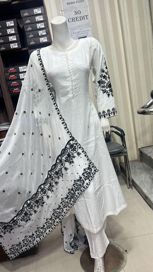 3 Pc Embroidered Linen Dress With Chiffon Dupatta | UMNAA