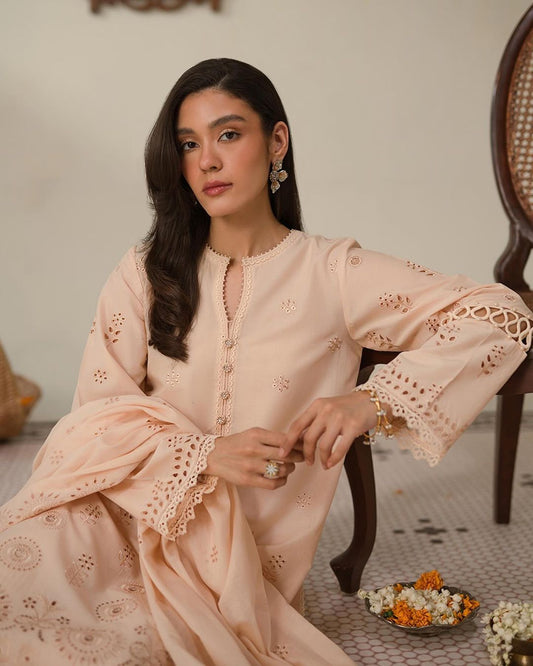 Ivory Peach 3 Pc Chikenkari Lawn Dress - Umnaa